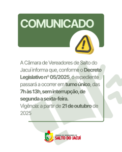 A partir do dia 21 de outubro, a Câmara de Vereadores de Salto do Jacuí passará a funcionar em turno único, com expediente das 7h às 13h, de segunda a sexta-feira, conforme o Decreto Legislativo nº 05/2025.