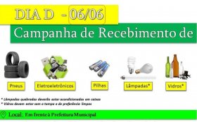 Administração Municipal de Salto do Jacuí 2021/2024 – Meio Ambiente. Fique atento ao dia D em 06/06 Mobilização de coleta será em frente a Prefeitura, o Departamento Municipal de Meio Ambiente está realizando a campanha do DIA D em comemoração ao Dia Mundial do Meio Ambiente. No dia 06 de junho haverá um grande ponto de coleta onde serão recebidos vários resíduos que NÃO podem ser descartados na natureza. O Departamento orienta a população para que organize e separe todos os eletroeletrônicos, pilhas, baterias, pneus e vidros que estão acumulados em casa e no dia D faça o descarte em um ponto de coleta, pois o Departamento de Meio Ambiente estará destinando os mesmos de forma ambientalmente correta. A diretora do Departamento, Cleonice Fredi lembra as pessoas da importância da atitude de cada um e de aderir a campanha SEPARE E NÃO PARE. “Cabe a nós criarmos medidas que impeçam que nossos impactos atinjam de modo irreversível a terra”, alerta Cleonice. Departamento Municipal de Meio Ambiente.
