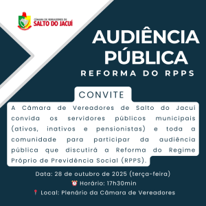 A Câmara de Vereadores de Salto do Jacuí convida todos os servidores públicos municipais (ativos, inativos e pensionistas) e demais interessados a participarem da Audiência Pública que discutirá a Reforma do Regime Próprio de Previdência Social (RPPS) do Município.
